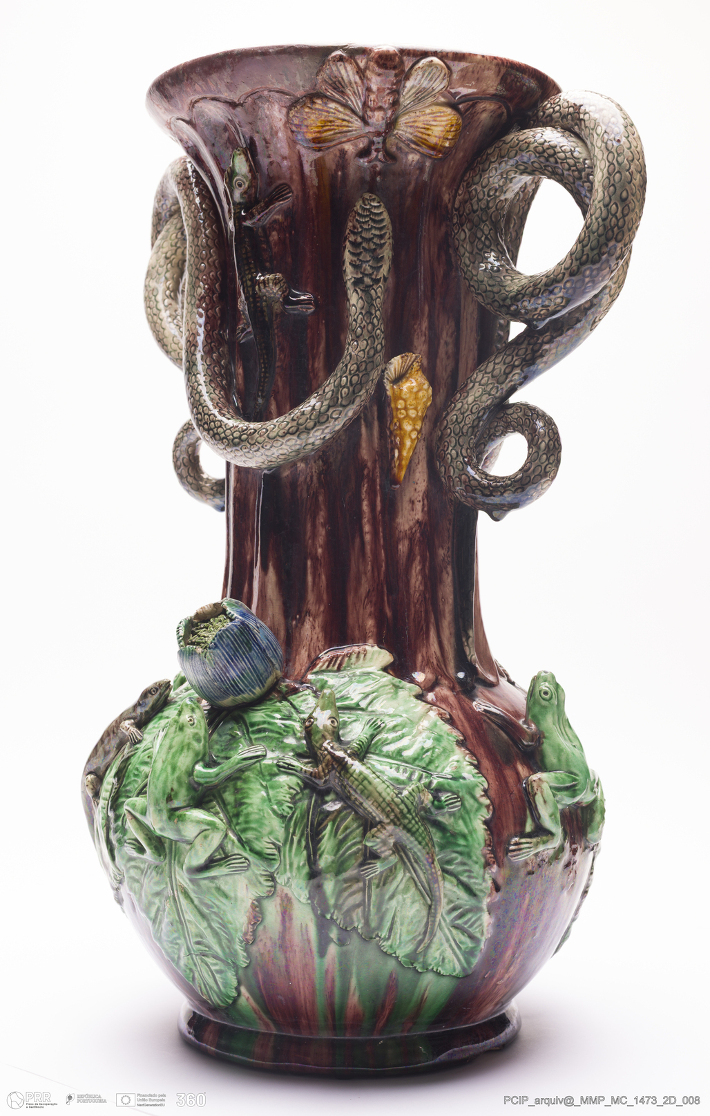 Matéria/Técnica: Barro branco moldado e modelado. Vidrado polícromo: castanho escuro e mel, verde, azul e amarelo; Cronologia: 1870-1887; Autoria: Manuel Cipriano Gomes Mafra / Fábrica De Manuel Cipriano Gomes O Mafra, Caldas da Rainha, Portugal; Dimensões (cm): Altura: 41; Largura: 35,5; Comprimento: 29.