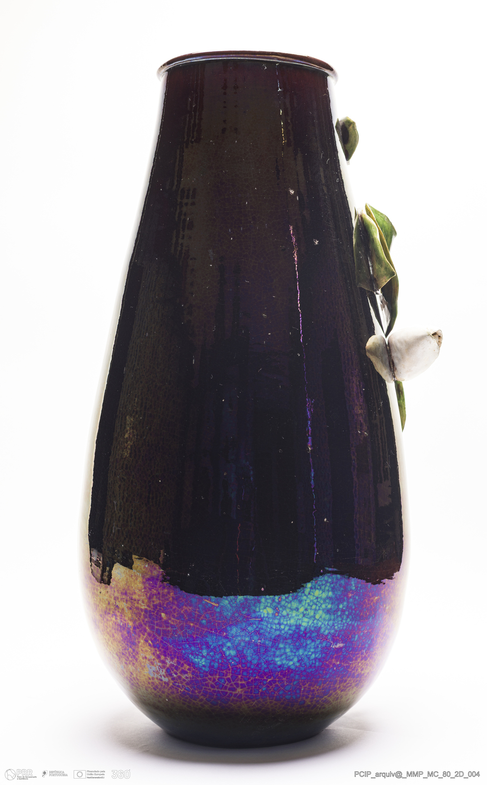 Matéria/Técnica: Barro vermelho rodao e modelado. Vidrado polícromo: verde, branco e castanho; Cronologia: 1908; Autoria: Rafael Bordalo Pinheiro / Fábrica Bordalo Pinheiro, Caldas da Rainha, Portugal; Dimensões (cm): Altura: 53,5; Largura: 29.