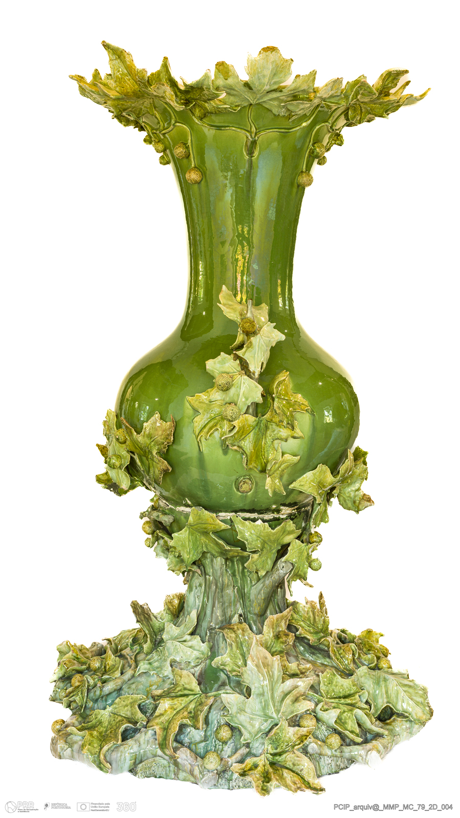 Matéria/Técnica: Barro vermelho moldado e modelado. Vidrado polícromo: verde e castanho mel; Cronologia: 1901; Autoria: Rafael Bordalo Pinheiro / Fábrica de Faianças das Caldas da Rainha, Portugal; Dimensões (cm): Altura: 1250; Largura: 74; Comprimento: 75.
