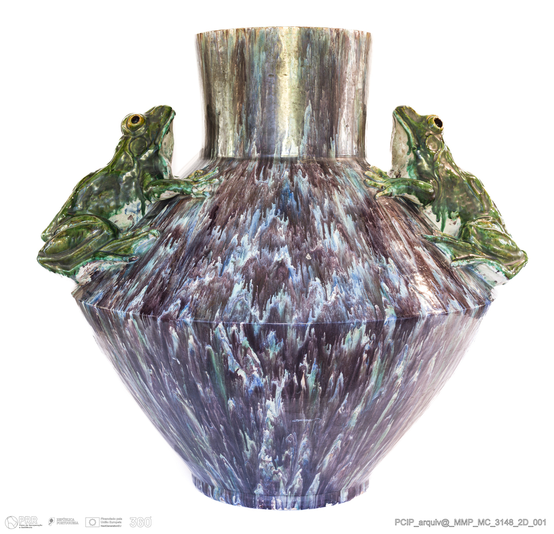 Matéria/Técnica: Barro rodado e modelado. Vidrado polícromo com escorridos: azul, castanho, verde e branco; Cronologia: Século XX; Autoria: Desconhecido / Caldas da Rainha, Portugal; Dimensões (cm): Altura: 76; Largura: 76; Comprimento: 65.
