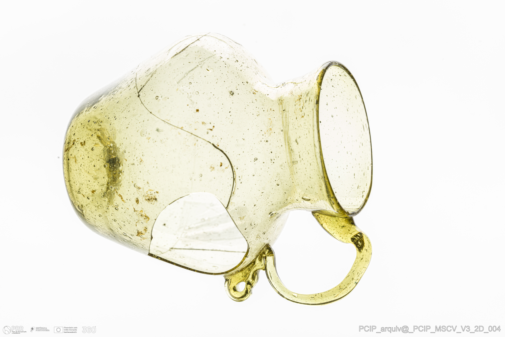 Matéria/Técnica: Vidro; Cronologia: Século XVII; Autoria: Desconhecida; Dimensões: Diâmetro bordo: 39mm; Diâmetro base: 29mm; Altura: 74mm.