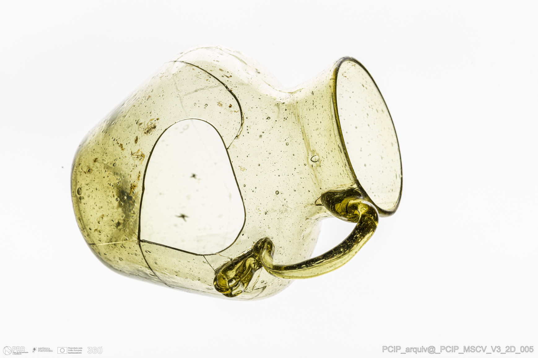 Matéria/Técnica: Vidro; Cronologia: Século XVII; Autoria: Desconhecida; Dimensões: Diâmetro bordo: 39mm; Diâmetro base: 29mm; Altura: 74mm.