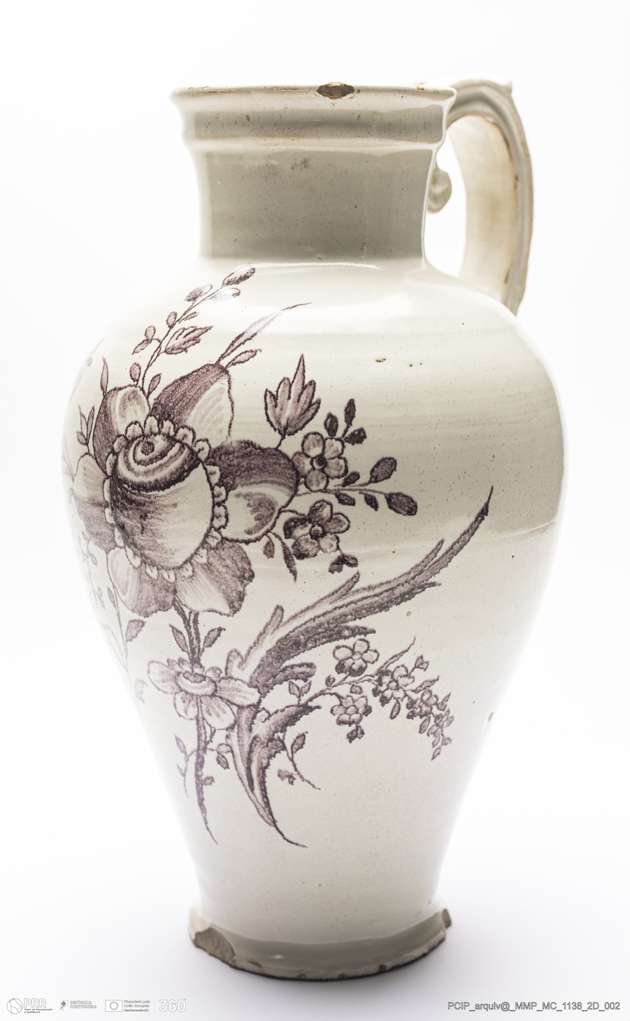 Matéria/Técnica: Barro branco moldado e modelado. Vidrado branco de estanho e decoração a castanho manganês; Cronologia: séculos XVIII-XIX; Autoria: Desconhecido / Atribuído à Fábrica de Louças de Santo António do Vale da Piedade, Vila Nova de Gaia, Portugal; Dimensões (cm): Altura: 33,8; Largura: 23,3.