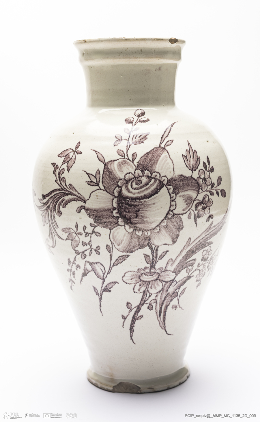 Matéria/Técnica: Barro branco moldado e modelado. Vidrado branco de estanho e decoração a castanho manganês; Cronologia: séculos XVIII-XIX; Autoria: Desconhecido / Atribuído à Fábrica de Louças de Santo António do Vale da Piedade, Vila Nova de Gaia, Portugal; Dimensões (cm): Altura: 33,8; Largura: 23,3.