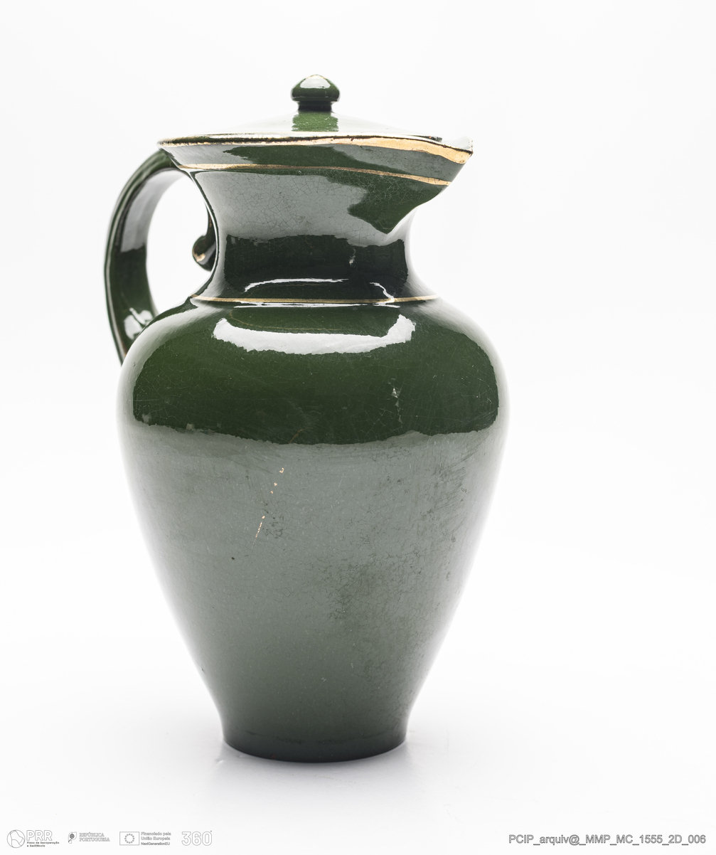 Matéria/Técnica: Barro moldado. Vidrado verde e pintura dourada a frio; Cronologia: 1908-1916; Autoria: António Augusto da Costa Motta / Fábrica Das Faianças das Caldas da Rainha; Dimensões (cm): Altura: 16; Largura: 13; Comprimento: 11.