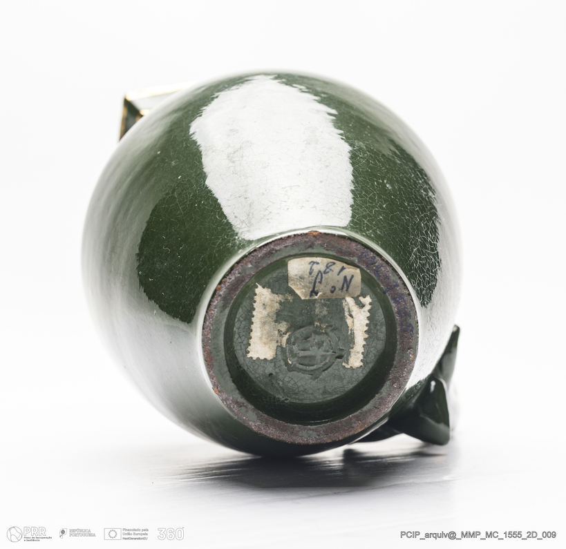 Matéria/Técnica: Barro moldado. Vidrado verde e pintura dourada a frio; Cronologia: 1908-1916; Autoria: António Augusto da Costa Motta / Fábrica Das Faianças das Caldas da Rainha; Dimensões (cm): Altura: 16; Largura: 13; Comprimento: 11.
