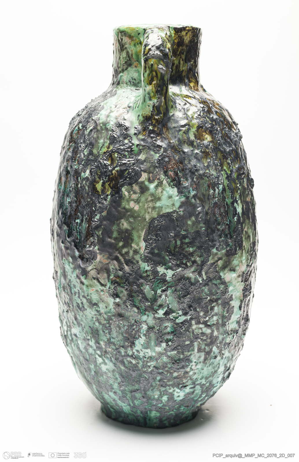 Matéria/Técnica: Barro vermelho modelado. Vidrado polícromo: preto e verde; Cronologia: 1967; Autoria: Maria Luisa Fragoso / Estudio Escola de Cerâmica, Lisboa, Portugal; Dimensões (cm): Altura: 34; Diâmetro: 17,5.