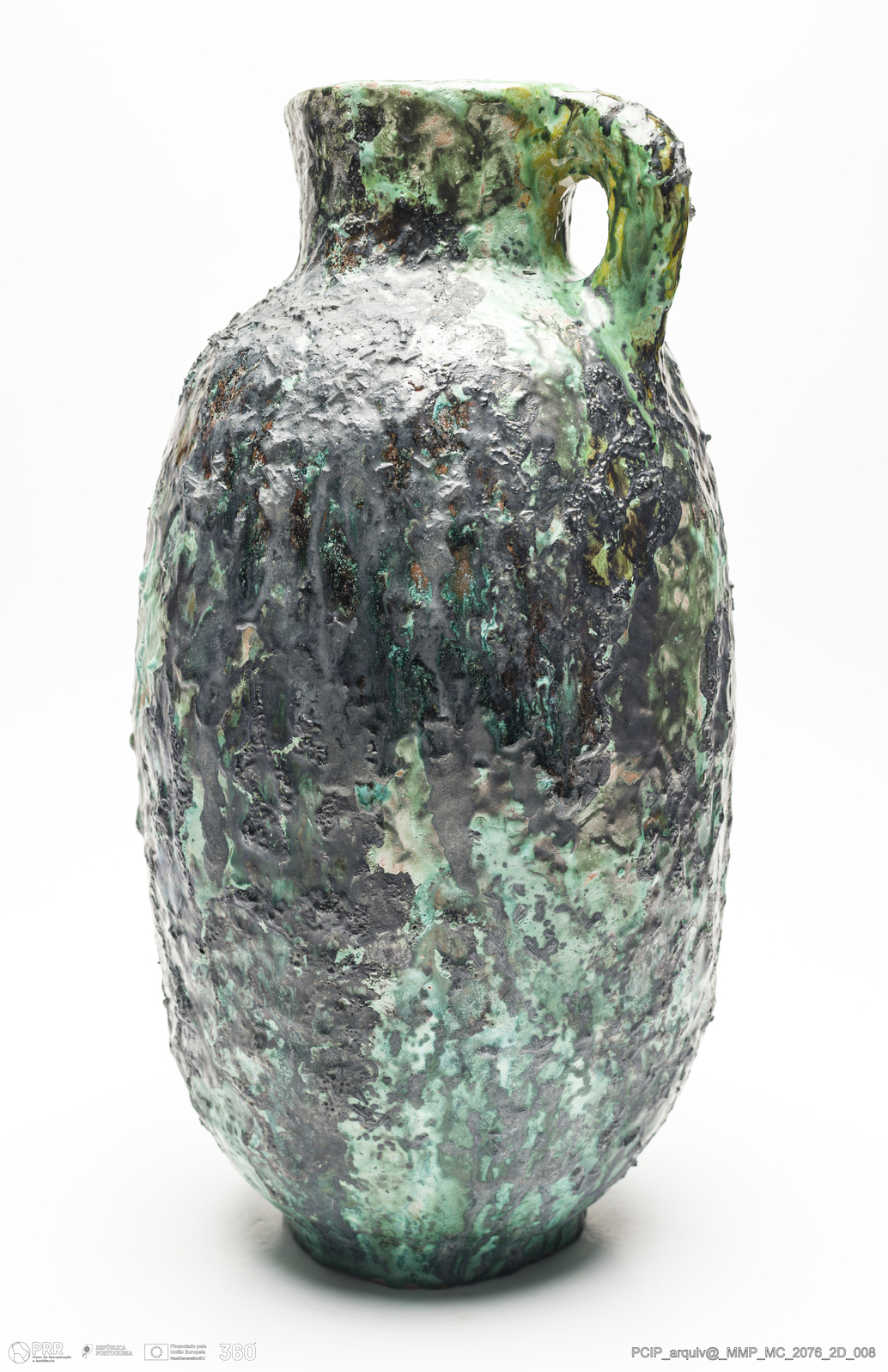 Matéria/Técnica: Barro vermelho modelado. Vidrado polícromo: preto e verde; Cronologia: 1967; Autoria: Maria Luisa Fragoso / Estudio Escola de Cerâmica, Lisboa, Portugal; Dimensões (cm): Altura: 34; Diâmetro: 17,5.