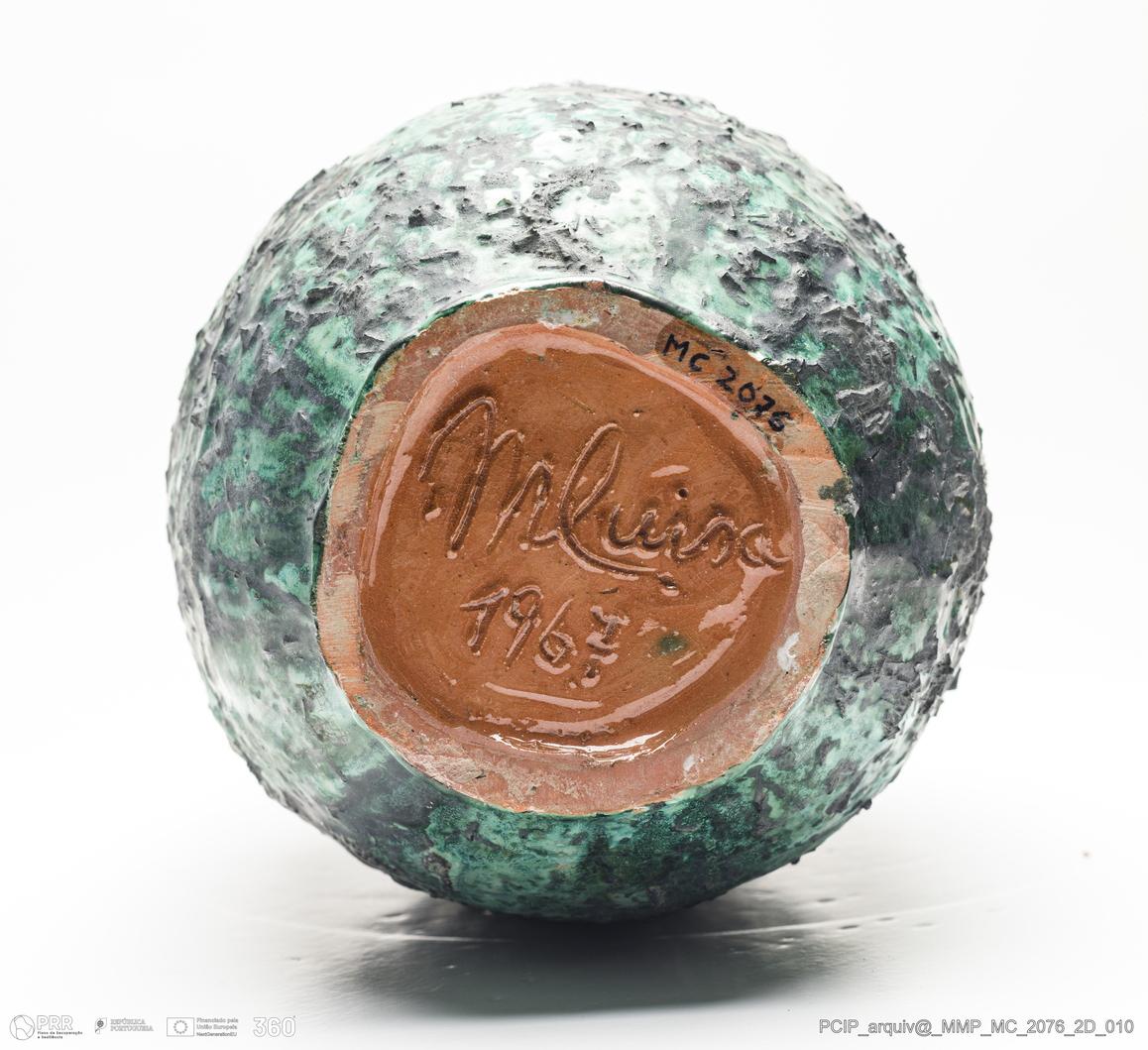Matéria/Técnica: Barro vermelho modelado. Vidrado polícromo: preto e verde; Cronologia: 1967; Autoria: Maria Luisa Fragoso / Estudio Escola de Cerâmica, Lisboa, Portugal; Dimensões (cm): Altura: 34; Diâmetro: 17,5.