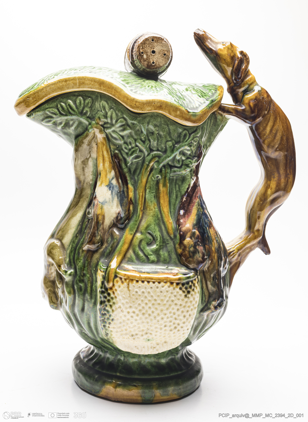 Matéria/Técnica: Barro moldado. Vidrado polícromo: castanho, verde, camurça, amarelo e azul; Cronologia: 1884-1939; Autoria: Herculano Elias / Oficina de Herculano Elias, Caldas da Rainha, Portugal; Dimensões (cm): Altura: 33; Largura: 24,5; Comprimento: 18,5.