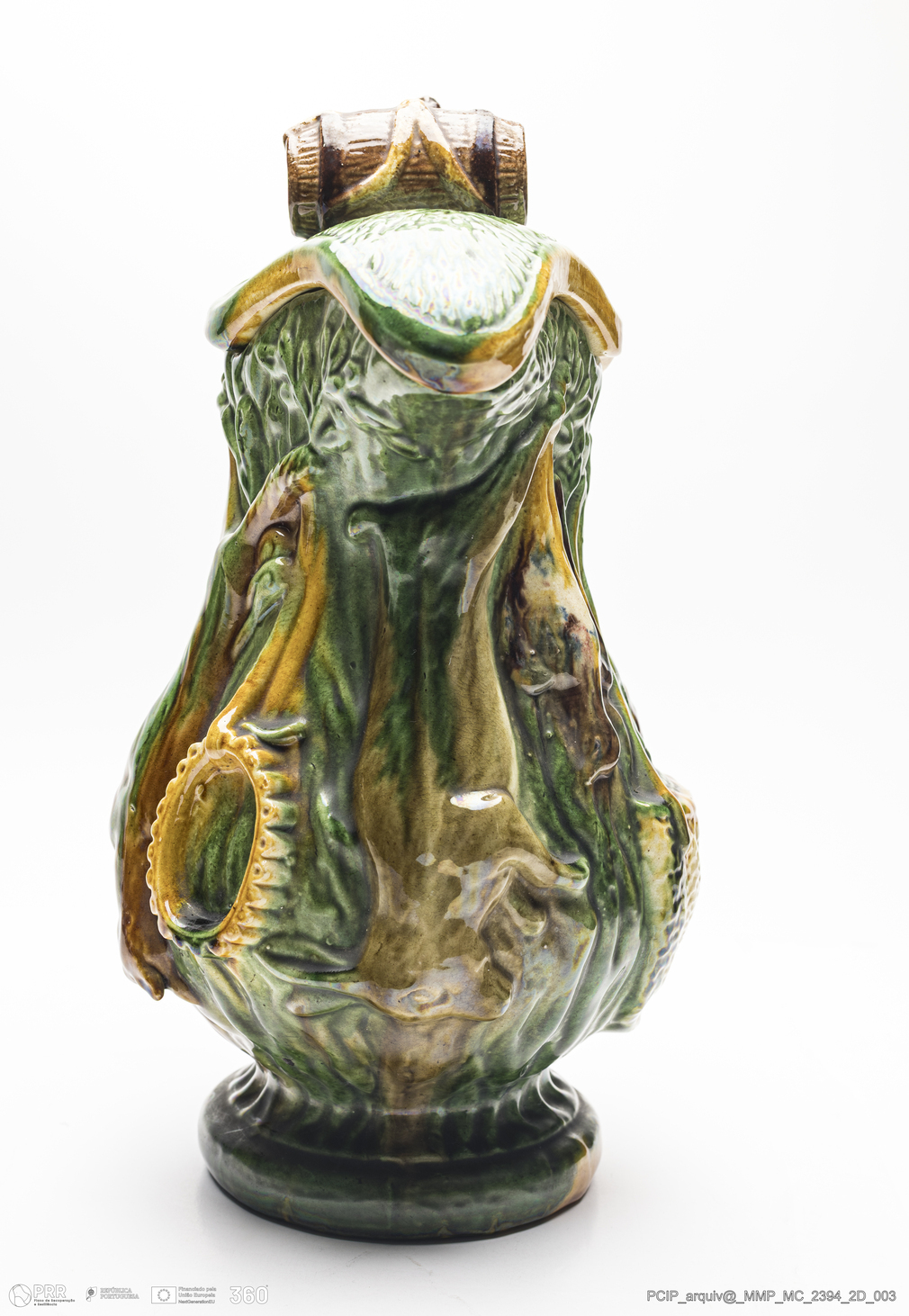 Matéria/Técnica: Barro moldado. Vidrado polícromo: castanho, verde, camurça, amarelo e azul; Cronologia: 1884-1939; Autoria: Herculano Elias / Oficina de Herculano Elias, Caldas da Rainha, Portugal; Dimensões (cm): Altura: 33; Largura: 24,5; Comprimento: 18,5.