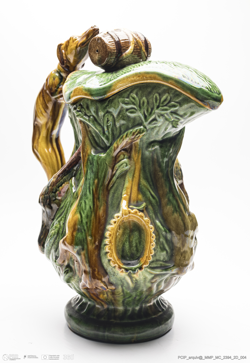 Matéria/Técnica: Barro moldado. Vidrado polícromo: castanho, verde, camurça, amarelo e azul; Cronologia: 1884-1939; Autoria: Herculano Elias / Oficina de Herculano Elias, Caldas da Rainha, Portugal; Dimensões (cm): Altura: 33; Largura: 24,5; Comprimento: 18,5.