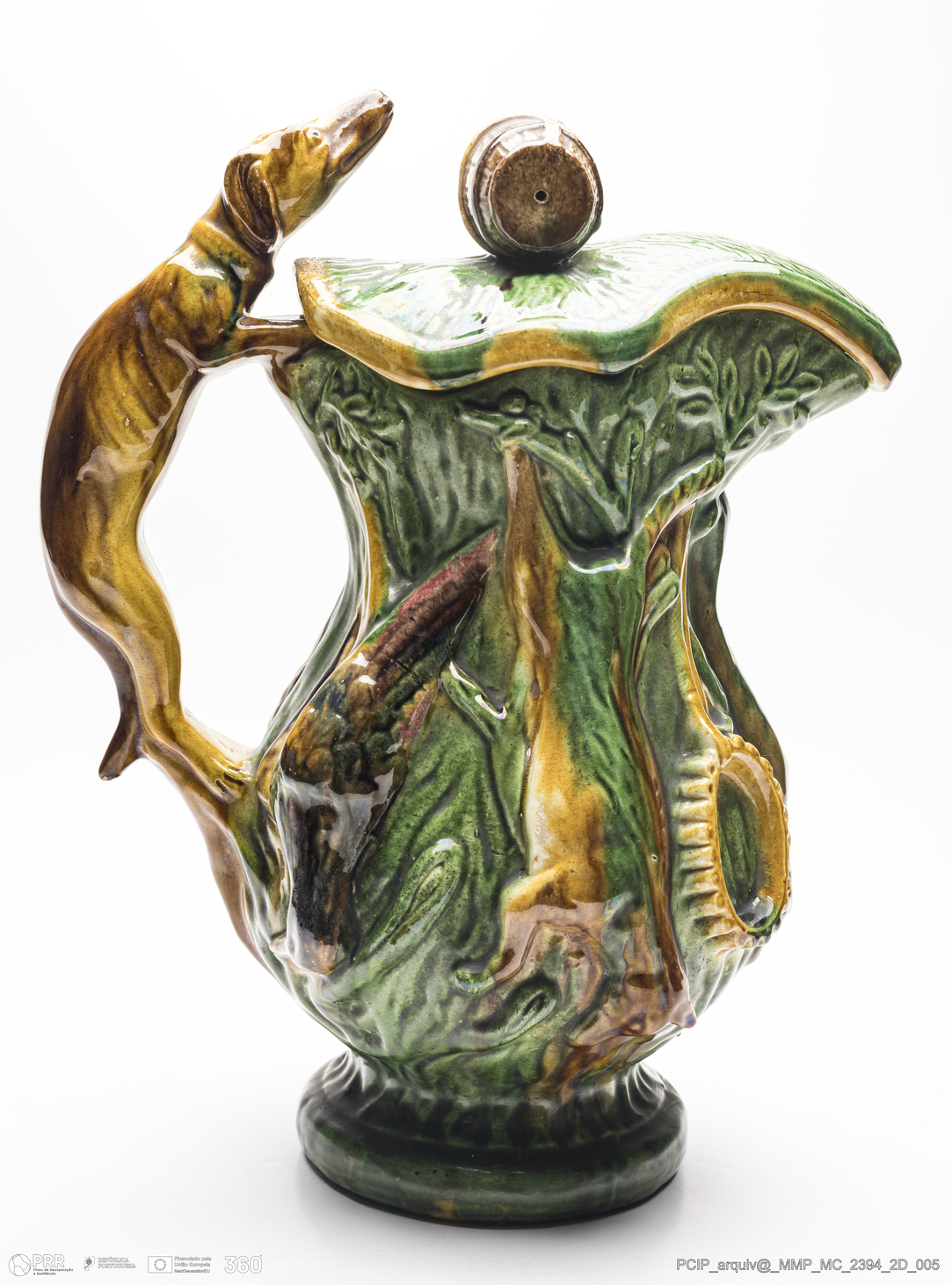 Matéria/Técnica: Barro moldado. Vidrado polícromo: castanho, verde, camurça, amarelo e azul; Cronologia: 1884-1939; Autoria: Herculano Elias / Oficina de Herculano Elias, Caldas da Rainha, Portugal; Dimensões (cm): Altura: 33; Largura: 24,5; Comprimento: 18,5.