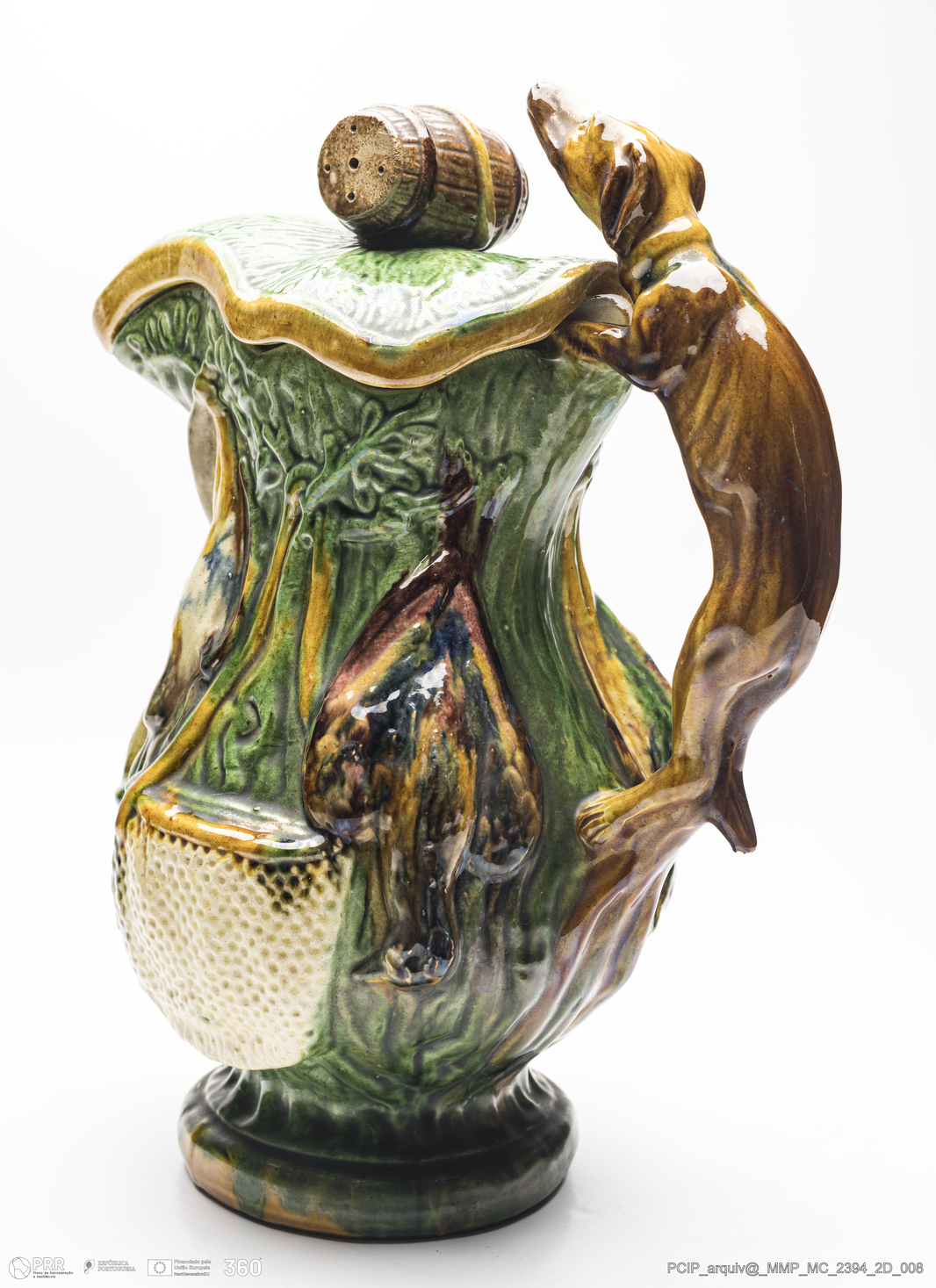 Matéria/Técnica: Barro moldado. Vidrado polícromo: castanho, verde, camurça, amarelo e azul; Cronologia: 1884-1939; Autoria: Herculano Elias / Oficina de Herculano Elias, Caldas da Rainha, Portugal; Dimensões (cm): Altura: 33; Largura: 24,5; Comprimento: 18,5.