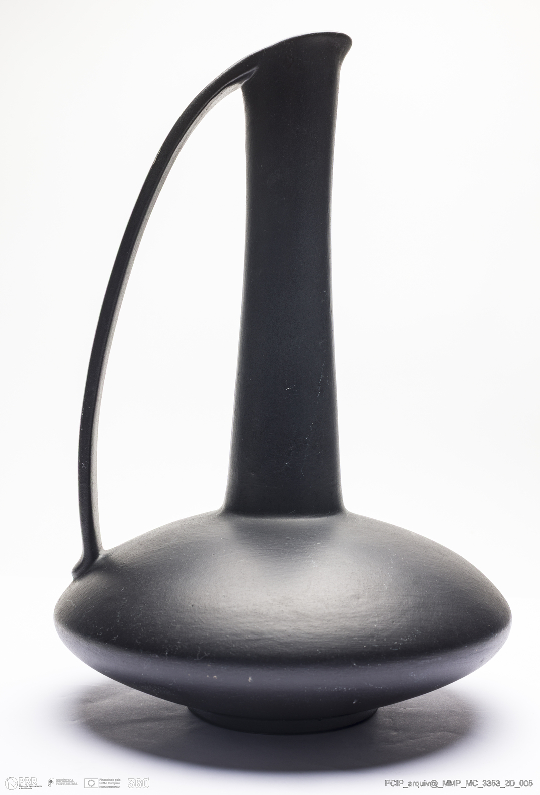 Matéria/Técnica: Barro branco moldado. Pintura a frio monocroma a preto; Cronologia: Século XX; Autoria: Desconhecido / Áustria; Dimensões (cm): Altura: 34; Diâmetro: 21,5.