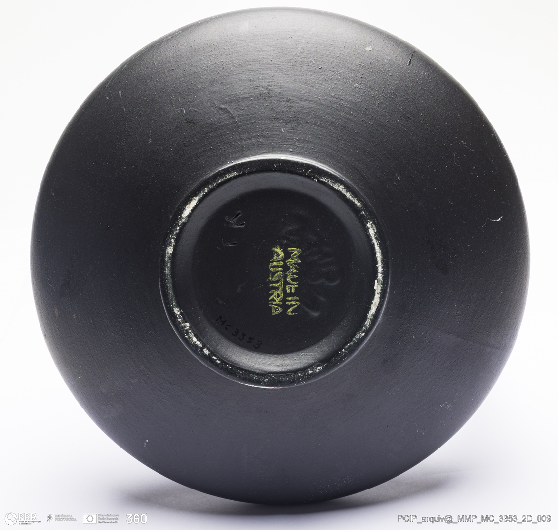 Matéria/Técnica: Barro branco moldado. Pintura a frio monocroma a preto; Cronologia: Século XX; Autoria: Desconhecido / Áustria; Dimensões (cm): Altura: 34; Diâmetro: 21,5.