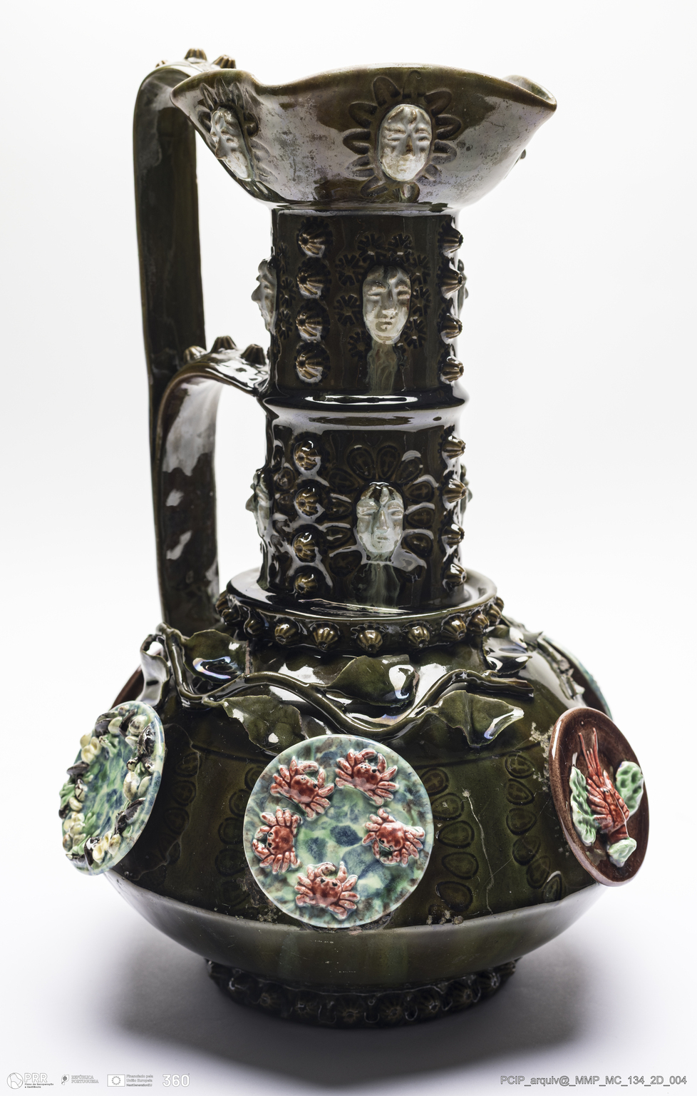Matéria/Técnica: Barro vermelho moldado. Vidrado polícromo: castanho escuro e mel, preto, verde, vermelho, azul e camurça; Cronologia: 1888; Autoria: Rafael Bordalo Pinheiro / Fábrica de Faianças das Caldas da Rainha, Portugal; Dimensões (cm): Altura: 30; Largura: 21.
