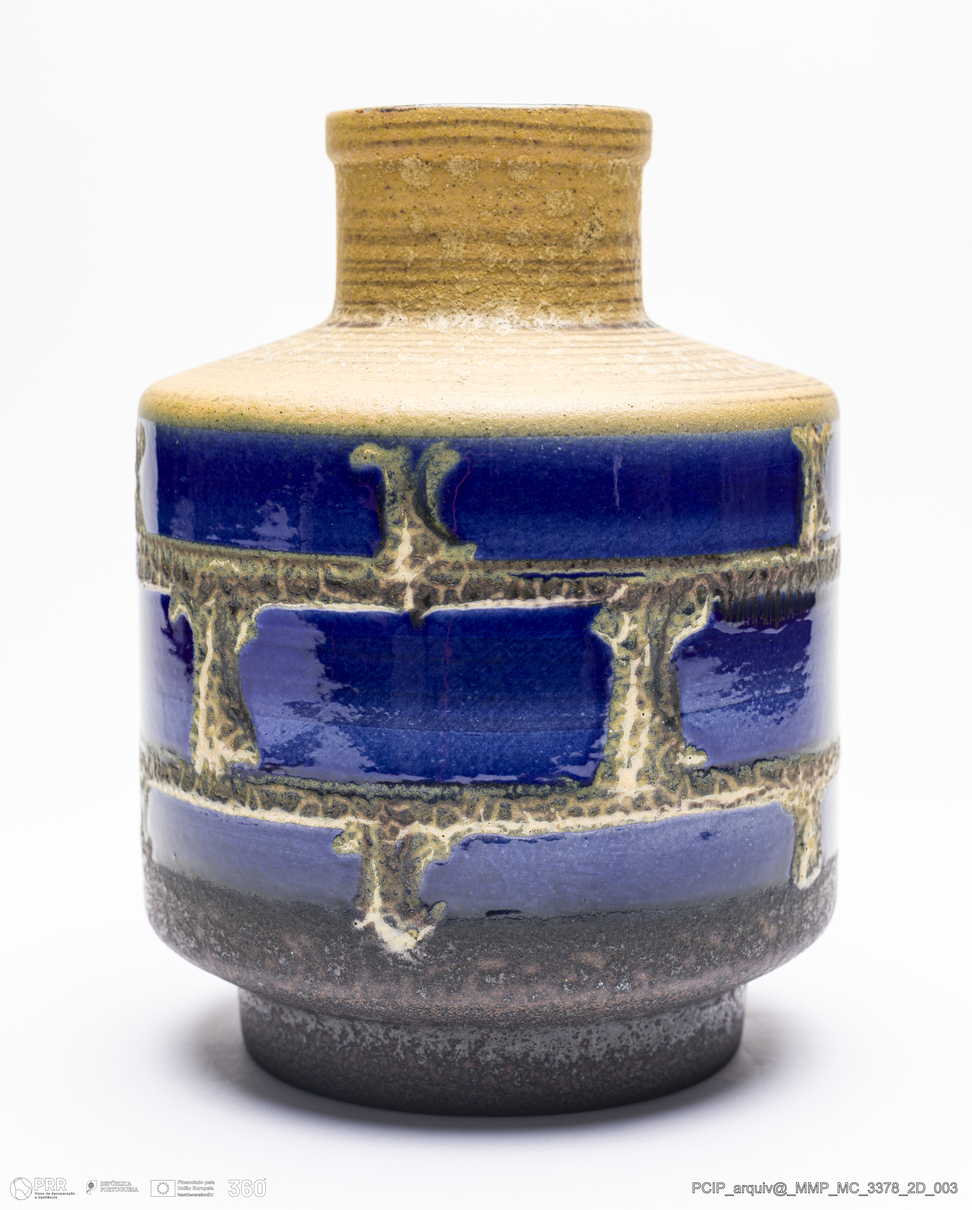 Matéria/Técnica: Barro vermelho rodado. Vidrados reactivos e polícromos: azul, castanho escuro e mel, cinzento; Cronologia: 1960-1970; Autoria: Desconhecido / Scheurich, Alemanha; Dimensões (cm): Altura: 20; Largura: 15,4; Comprimento: 17,5.