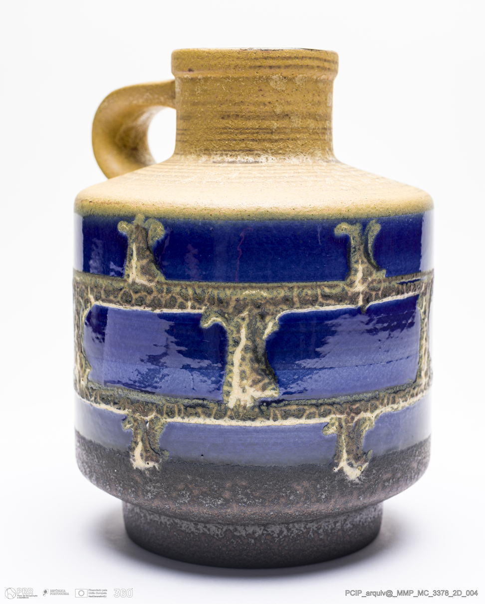 Matéria/Técnica: Barro vermelho rodado. Vidrados reactivos e polícromos: azul, castanho escuro e mel, cinzento; Cronologia: 1960-1970; Autoria: Desconhecido / Scheurich, Alemanha; Dimensões (cm): Altura: 20; Largura: 15,4; Comprimento: 17,5.