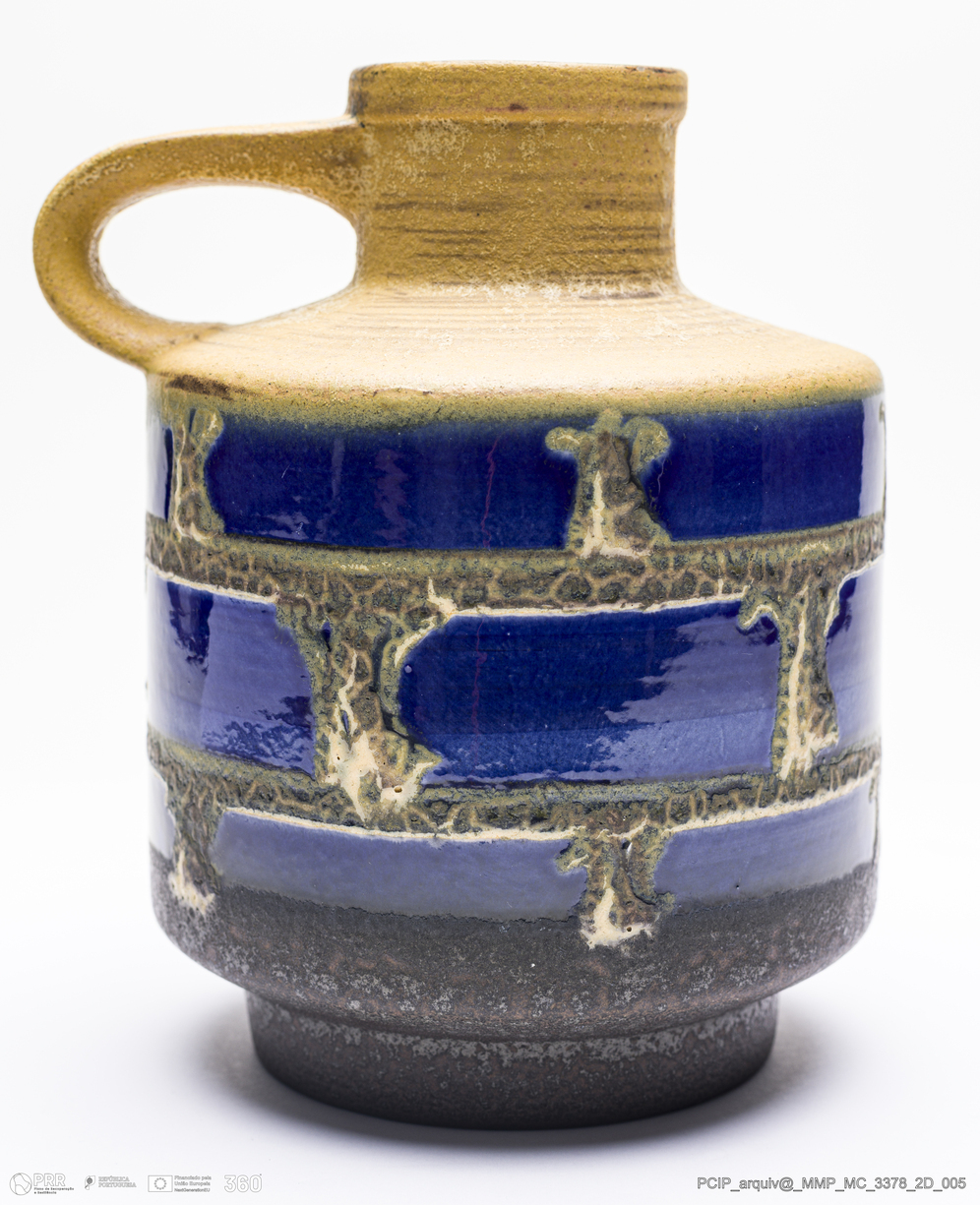 Matéria/Técnica: Barro vermelho rodado. Vidrados reactivos e polícromos: azul, castanho escuro e mel, cinzento; Cronologia: 1960-1970; Autoria: Desconhecido / Scheurich, Alemanha; Dimensões (cm): Altura: 20; Largura: 15,4; Comprimento: 17,5.