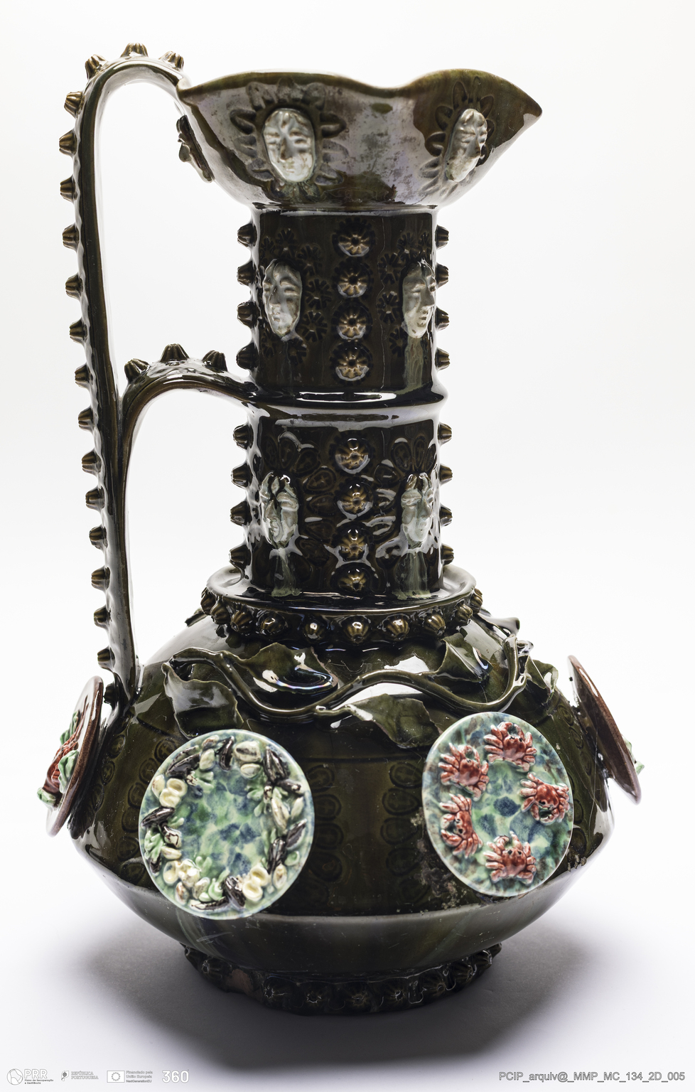 Matéria/Técnica: Barro vermelho moldado. Vidrado polícromo: castanho escuro e mel, preto, verde, vermelho, azul e camurça; Cronologia: 1888; Autoria: Rafael Bordalo Pinheiro / Fábrica de Faianças das Caldas da Rainha, Portugal; Dimensões (cm): Altura: 30; Largura: 21.