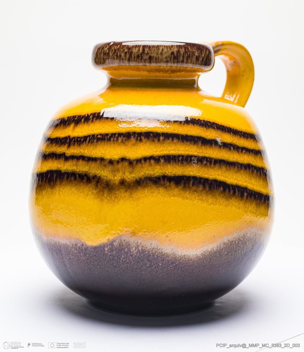 Matéria/Técnica: Faiança moldada. Vidrado polícromo com escorridos: castanho e amarelo; Cronologia: 1960-1970; Autoria: Desconhecido / Scheurich, Alemanha; Dimensões (cm): Altura: 22,2; Largura: 21,4; Comprimento: 23.