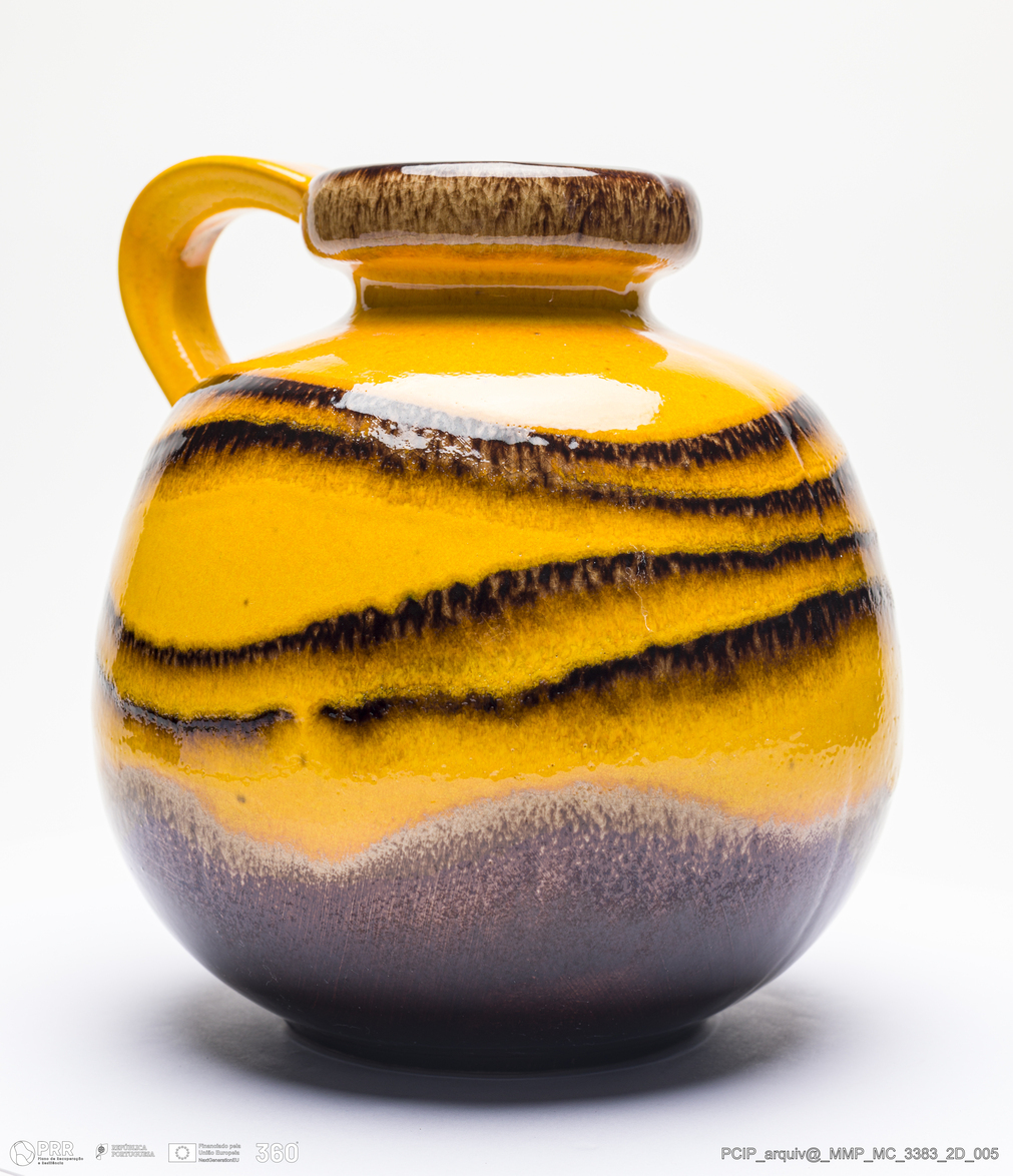 Matéria/Técnica: Faiança moldada. Vidrado polícromo com escorridos: castanho e amarelo; Cronologia: 1960-1970; Autoria: Desconhecido / Scheurich, Alemanha; Dimensões (cm): Altura: 22,2; Largura: 21,4; Comprimento: 23.