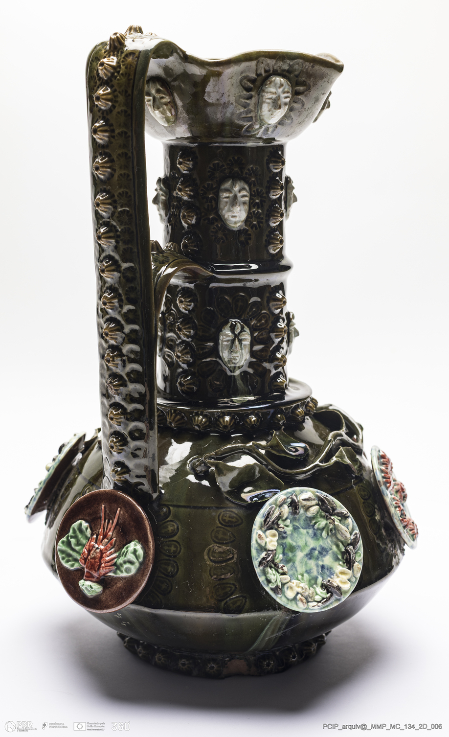 Matéria/Técnica: Barro vermelho moldado. Vidrado polícromo: castanho escuro e mel, preto, verde, vermelho, azul e camurça; Cronologia: 1888; Autoria: Rafael Bordalo Pinheiro / Fábrica de Faianças das Caldas da Rainha, Portugal; Dimensões (cm): Altura: 30; Largura: 21.