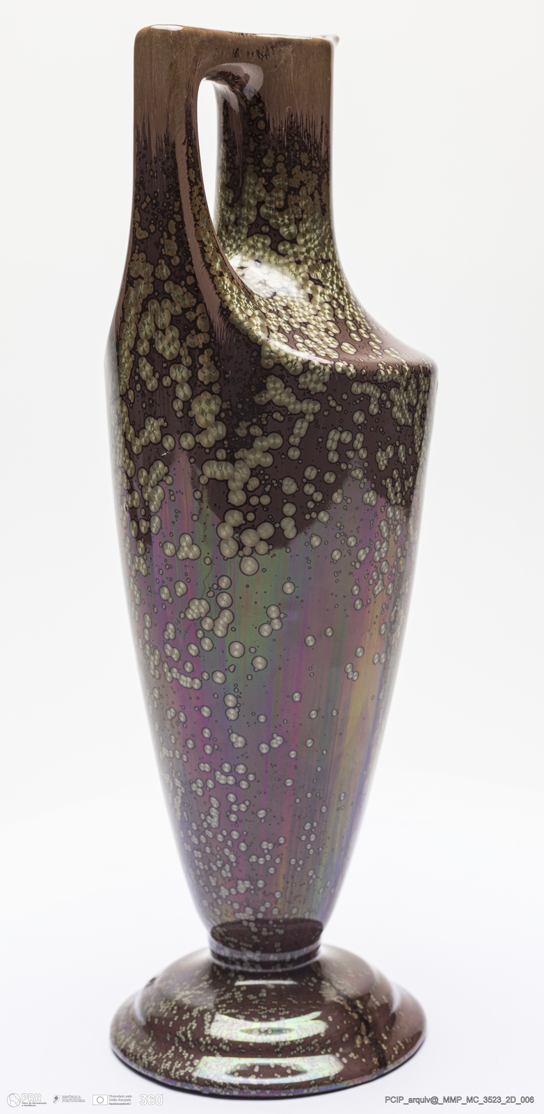 Matéria/Técnica: Barro vermelho rodado. Vidrado polícromo: castanho escuro e mel; Cronologia: 1922-1955; Autoria: Desconhecido / Sarreguemines, França; Dimensões (cm): Altura: 30,5; Diâmetro: 10.