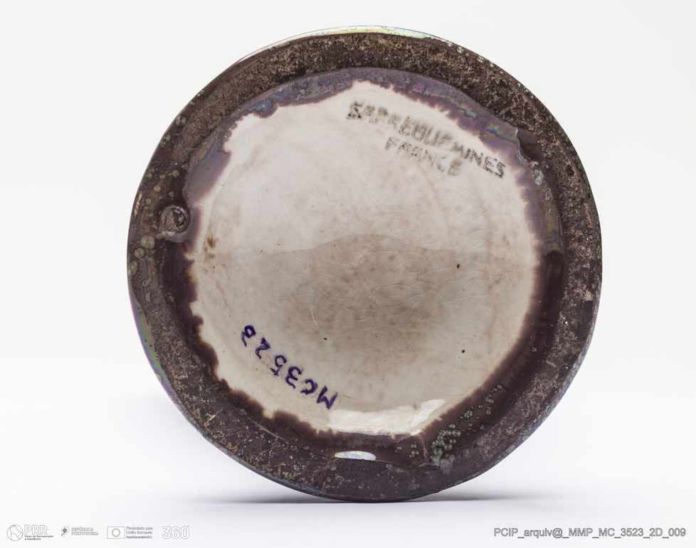 Matéria/Técnica: Barro vermelho rodado. Vidrado polícromo: castanho escuro e mel; Cronologia: 1922-1955; Autoria: Desconhecido / Sarreguemines, França; Dimensões (cm): Altura: 30,5; Diâmetro: 10.