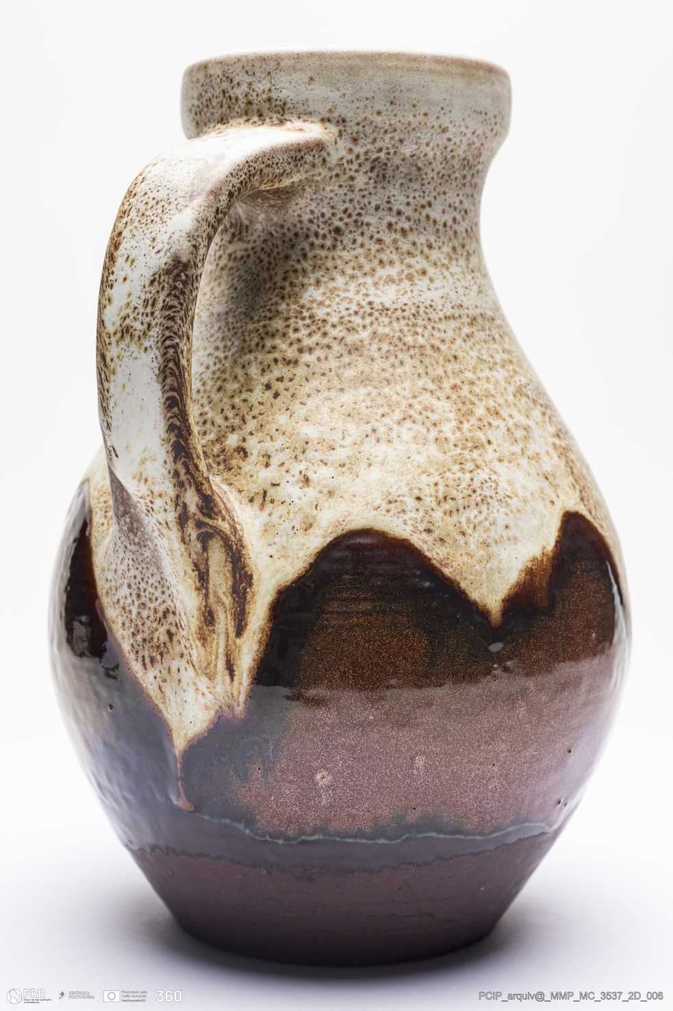 Matéria/Técnica: Barro vermelho rodado. Vidrado polícromo: castanho escuro e mel, creme e dourado; Cronologia: 1945-1984; Autoria: Desconhecido / Carstens, Alemanha; Dimensões (cm): Altura: 25,5; Largura: 17; Comprimento: 18,5.