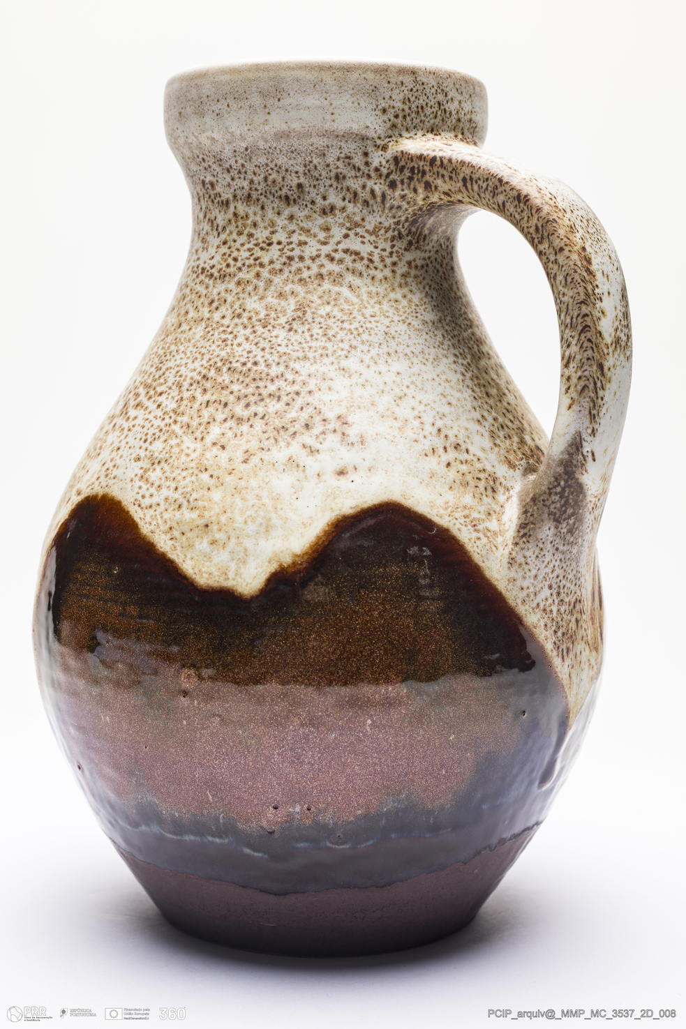 Matéria/Técnica: Barro vermelho rodado. Vidrado polícromo: castanho escuro e mel, creme e dourado; Cronologia: 1945-1984; Autoria: Desconhecido / Carstens, Alemanha; Dimensões (cm): Altura: 25,5; Largura: 17; Comprimento: 18,5.