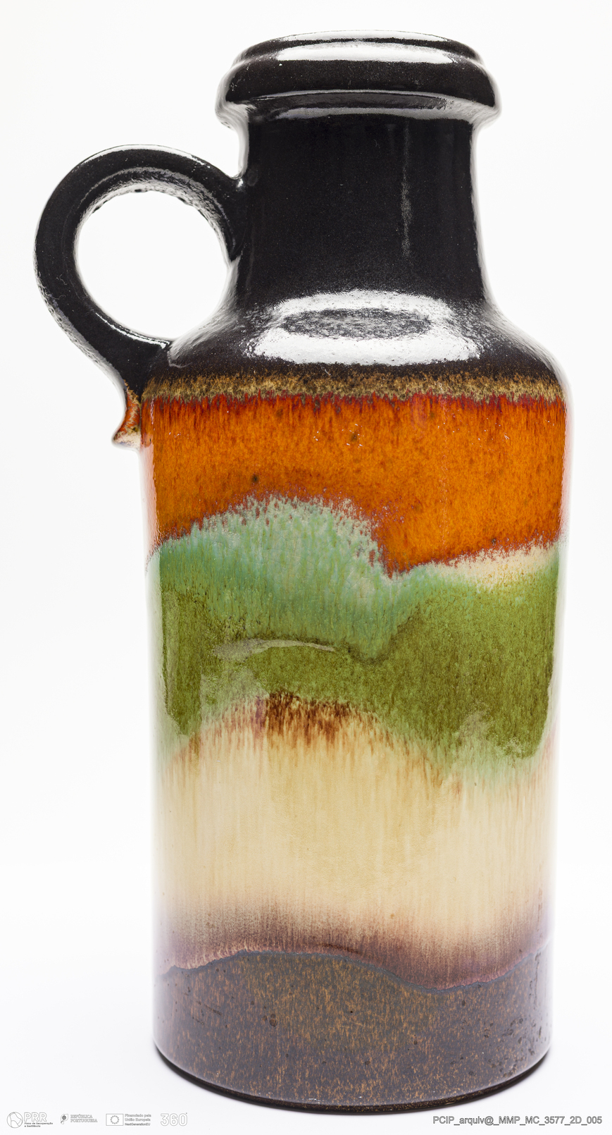 Matéria/Técnica: Barro vermelho moldado. Vidrado polícromo: preto, castanho escuro e mel, verde e laranja; Cronologia: 1960-1970; Autoria: Desconhecido / Scheurich, Alemanha; Dimensões (cm): Altura: 35,5; Largura: 14,5; Comprimento: 19.
