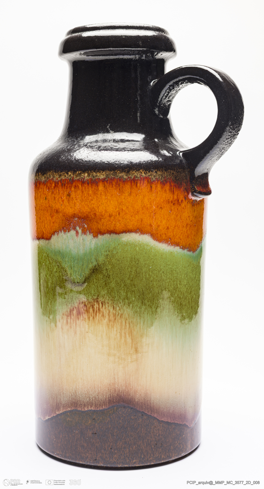 Matéria/Técnica: Barro vermelho moldado. Vidrado polícromo: preto, castanho escuro e mel, verde e laranja; Cronologia: 1960-1970; Autoria: Desconhecido / Scheurich, Alemanha; Dimensões (cm): Altura: 35,5; Largura: 14,5; Comprimento: 19.
