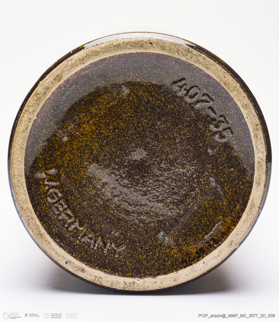 Matéria/Técnica: Barro vermelho moldado. Vidrado polícromo: preto, castanho escuro e mel, verde e laranja; Cronologia: 1960-1970; Autoria: Desconhecido / Scheurich, Alemanha; Dimensões (cm): Altura: 35,5; Largura: 14,5; Comprimento: 19.