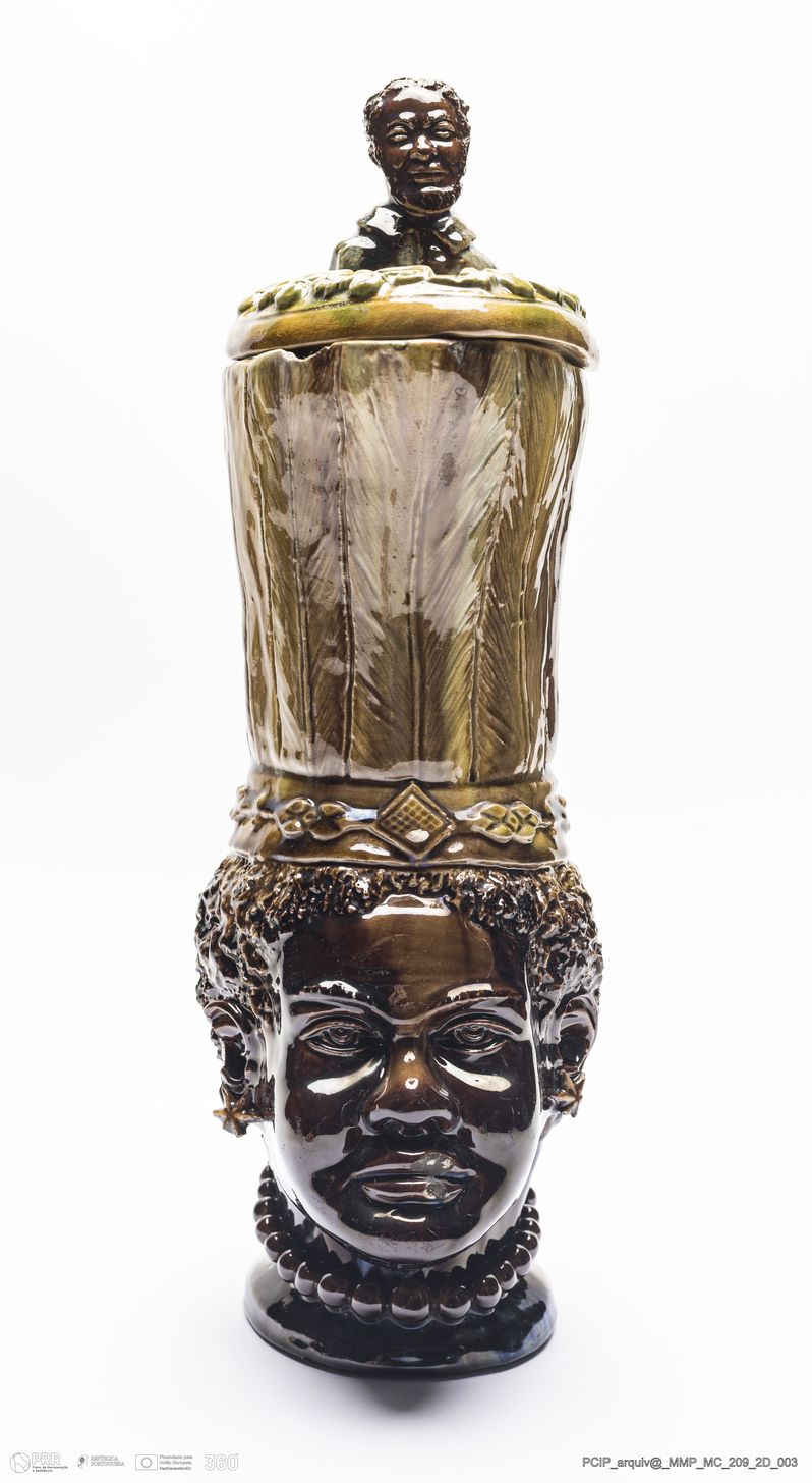 Matéria/Técnica: Barro vermelho moldado e modelado. Vidrado polícromo: verde de cobre, amarelo de ferro, castanho de manganês e azul cobalto; Cronologia: 1884-1905; Autoria: Rafael Bordalo Pinheiro / Fábrica de Faianças das Caldas da Rainha, Portugal; Dimensões (cm): Altura: 34,8; Largura: 21,6; Comprimento: 12,2.