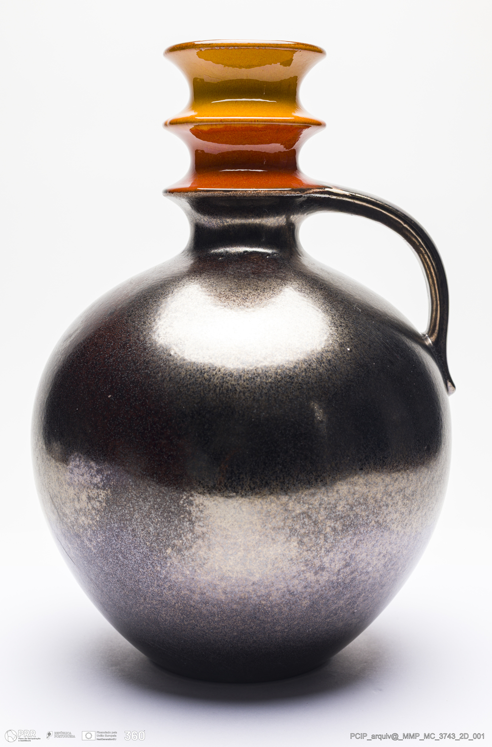 Matéria/Técnica: Barro vermelho moldado. Vidrado polícromo: preto, dourado, laranja e amarelo; Cronologia: 1945-1984; Autoria: Desconhecido / Carstens, Alemanha; Dimensões (cm): Altura: 31; Diâmetro: 21,5.