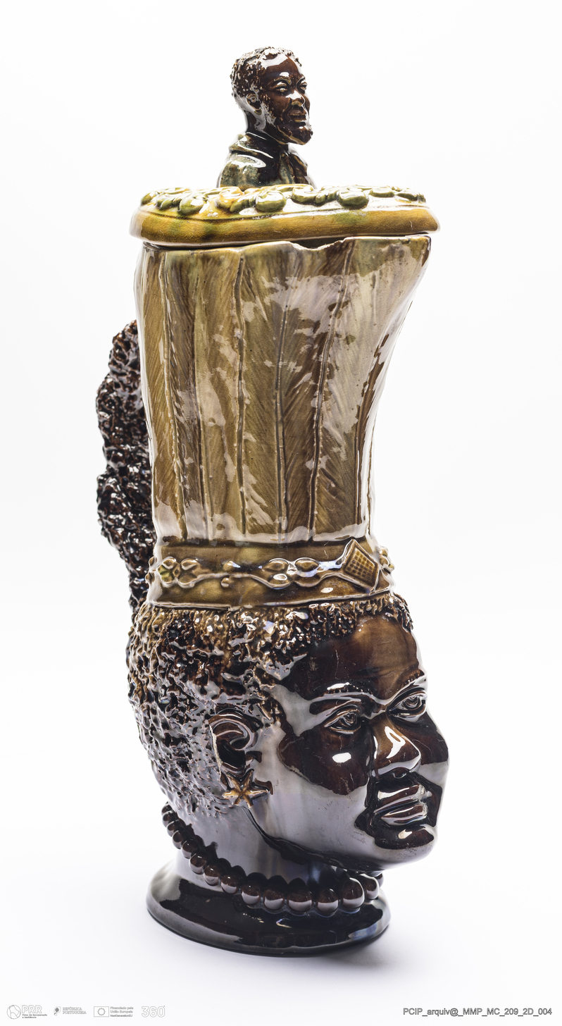 Matéria/Técnica: Barro vermelho moldado e modelado. Vidrado polícromo: verde de cobre, amarelo de ferro, castanho de manganês e azul cobalto; Cronologia: 1884-1905; Autoria: Rafael Bordalo Pinheiro / Fábrica de Faianças das Caldas da Rainha, Portugal; Dimensões (cm): Altura: 34,8; Largura: 21,6; Comprimento: 12,2.
