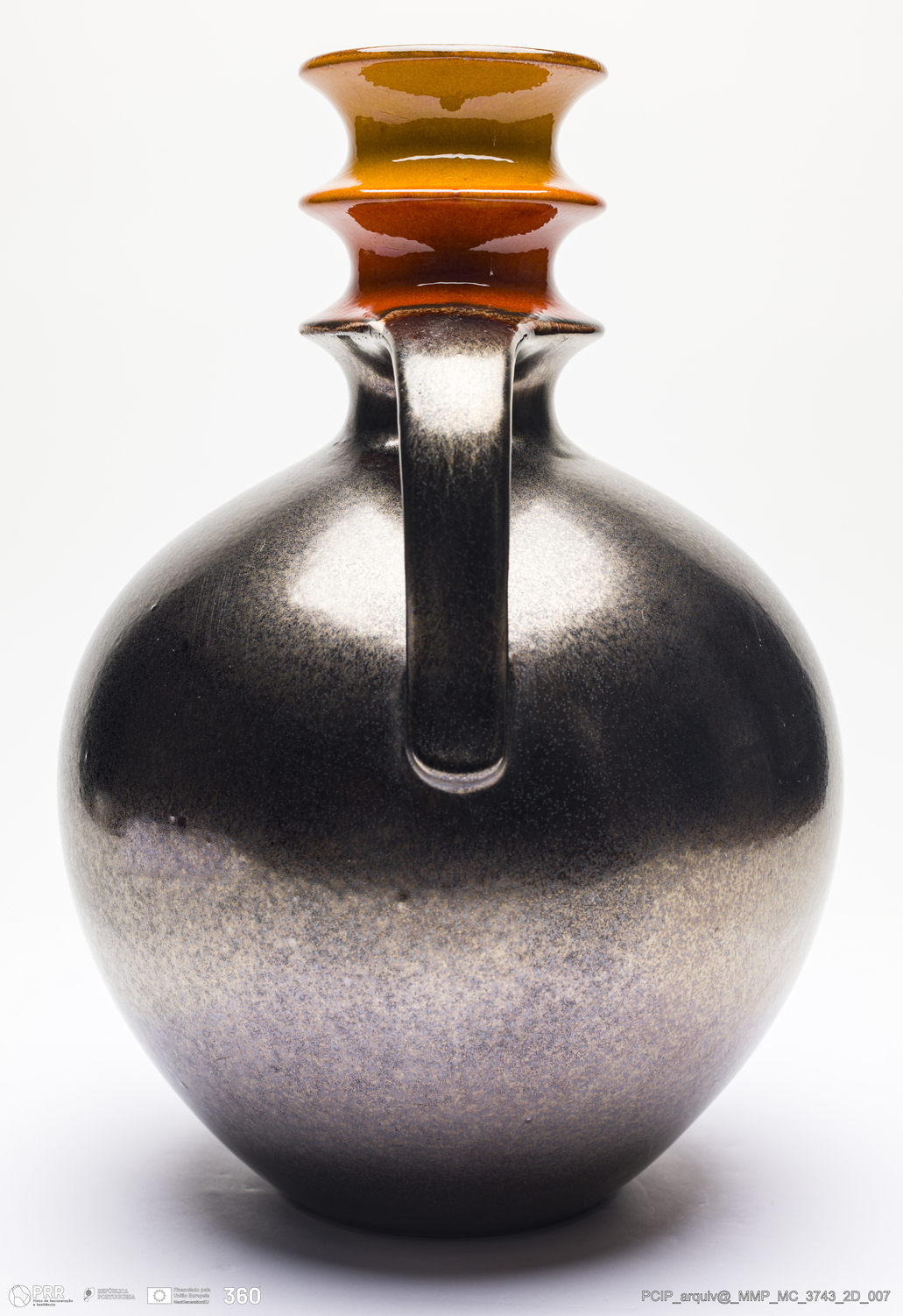 Matéria/Técnica: Barro vermelho moldado. Vidrado polícromo: preto, dourado, laranja e amarelo; Cronologia: 1945-1984; Autoria: Desconhecido / Carstens, Alemanha; Dimensões (cm): Altura: 31; Diâmetro: 21,5.
