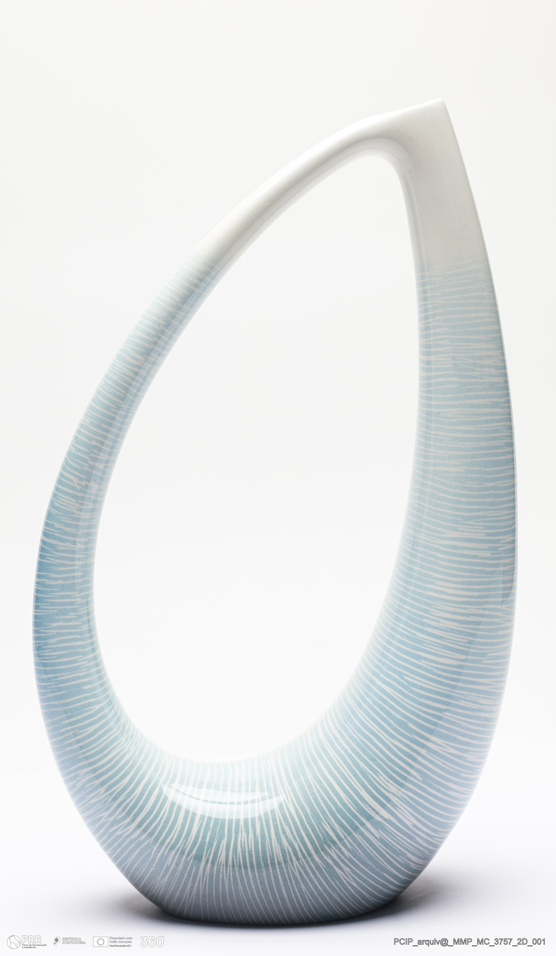 Matéria/Técnica: Barro branco moldado. Vidrado polícromo: cinzento, azul e branco; Cronologia: século XX; Autoria: Desconhecido / Ariete, Itália; Dimensões (cm): Altura: 33,5; Largura: 8; Comprimento: 19,5.