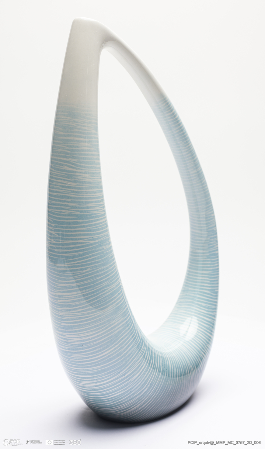 Matéria/Técnica: Barro branco moldado. Vidrado polícromo: cinzento, azul e branco; Cronologia: século XX; Autoria: Desconhecido / Ariete, Itália; Dimensões (cm): Altura: 33,5; Largura: 8; Comprimento: 19,5.