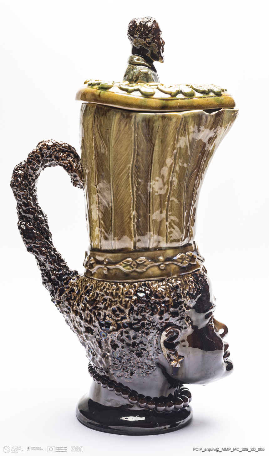 Matéria/Técnica: Barro vermelho moldado e modelado. Vidrado polícromo: verde de cobre, amarelo de ferro, castanho de manganês e azul cobalto; Cronologia: 1884-1905; Autoria: Rafael Bordalo Pinheiro / Fábrica de Faianças das Caldas da Rainha, Portugal; Dimensões (cm): Altura: 34,8; Largura: 21,6; Comprimento: 12,2.