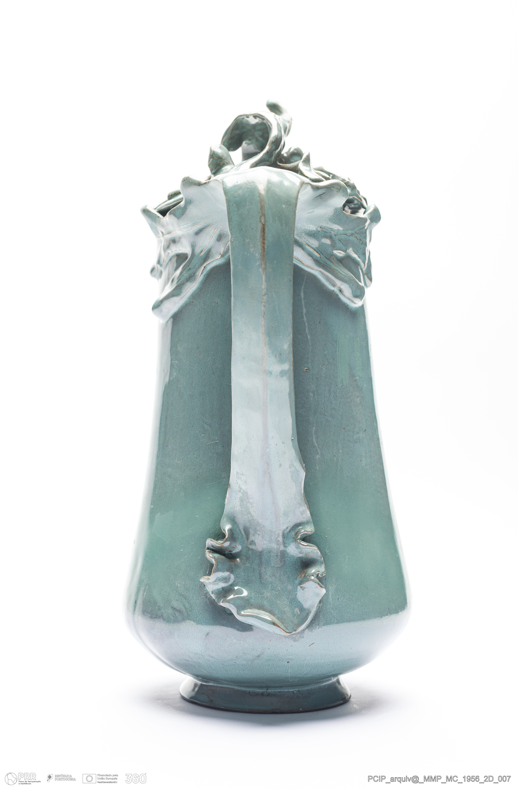 Matéria/Técnica: Barro vermelho moldado e modelado. Vidrado monocromo verde acinzentado; Cronologia: 1907-1916; Autoria: António Augusto da Costa Motta / Fábrica Das Faianças das Caldas da Rainha; Dimensões (cm): Altura: 27; Largura: 19.