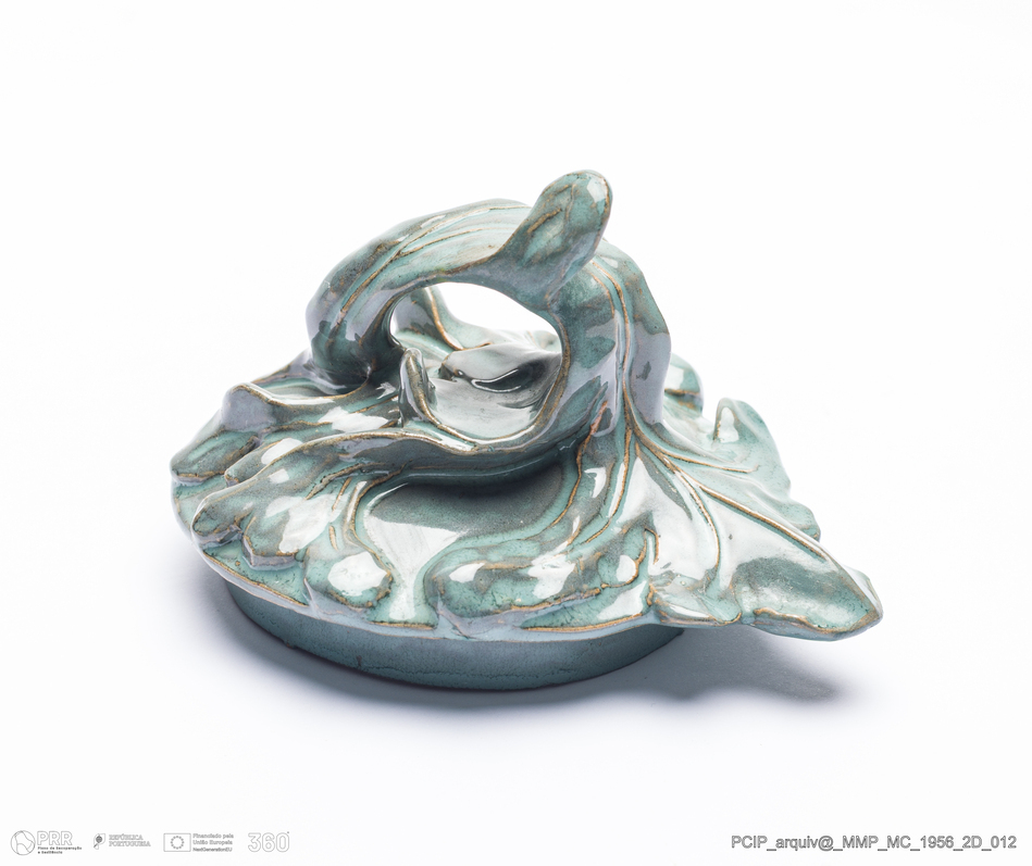 Matéria/Técnica: Barro vermelho moldado e modelado. Vidrado monocromo verde acinzentado; Cronologia: 1907-1916; Autoria: António Augusto da Costa Motta / Fábrica Das Faianças das Caldas da Rainha; Dimensões (cm): Altura: 27; Largura: 19.