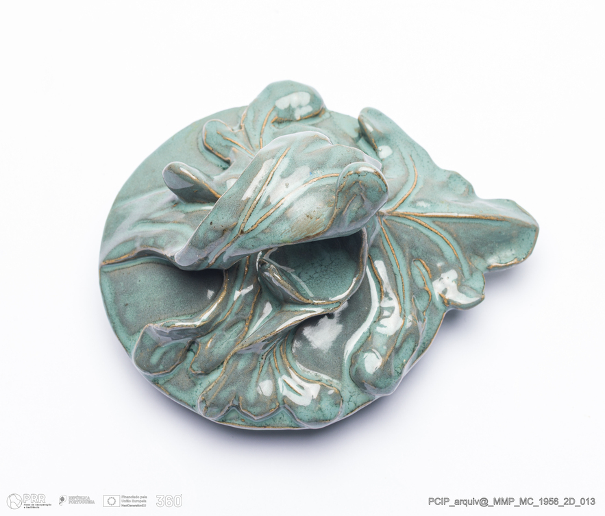 Matéria/Técnica: Barro vermelho moldado e modelado. Vidrado monocromo verde acinzentado; Cronologia: 1907-1916; Autoria: António Augusto da Costa Motta / Fábrica Das Faianças das Caldas da Rainha; Dimensões (cm): Altura: 27; Largura: 19.