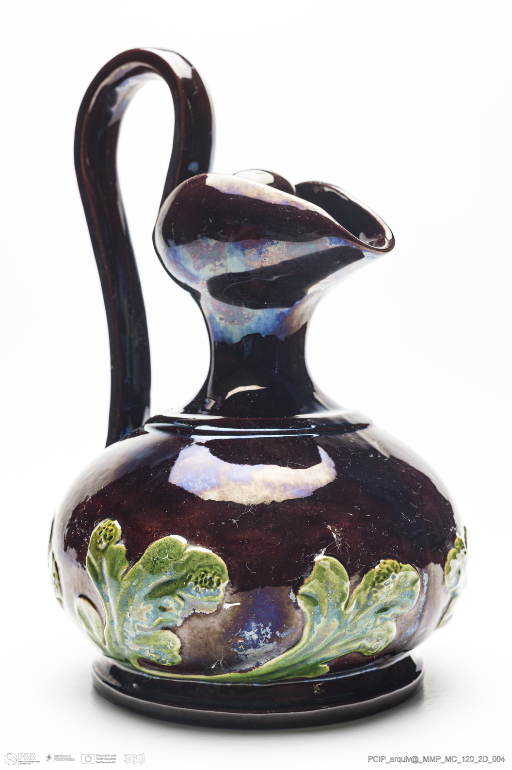 Matéria/Técnica: Barro vermelho moldado e modelado. Vidrado polícromo: castanho e verde; Cronologia: 1911; Autoria: Manuel Gustavo Bordalo Pinheiro / Fábrica Bordalo Pinheiro, Caldas da Rainha, Portugal; Dimensões (cm): Altura: 26; Largura: 20.