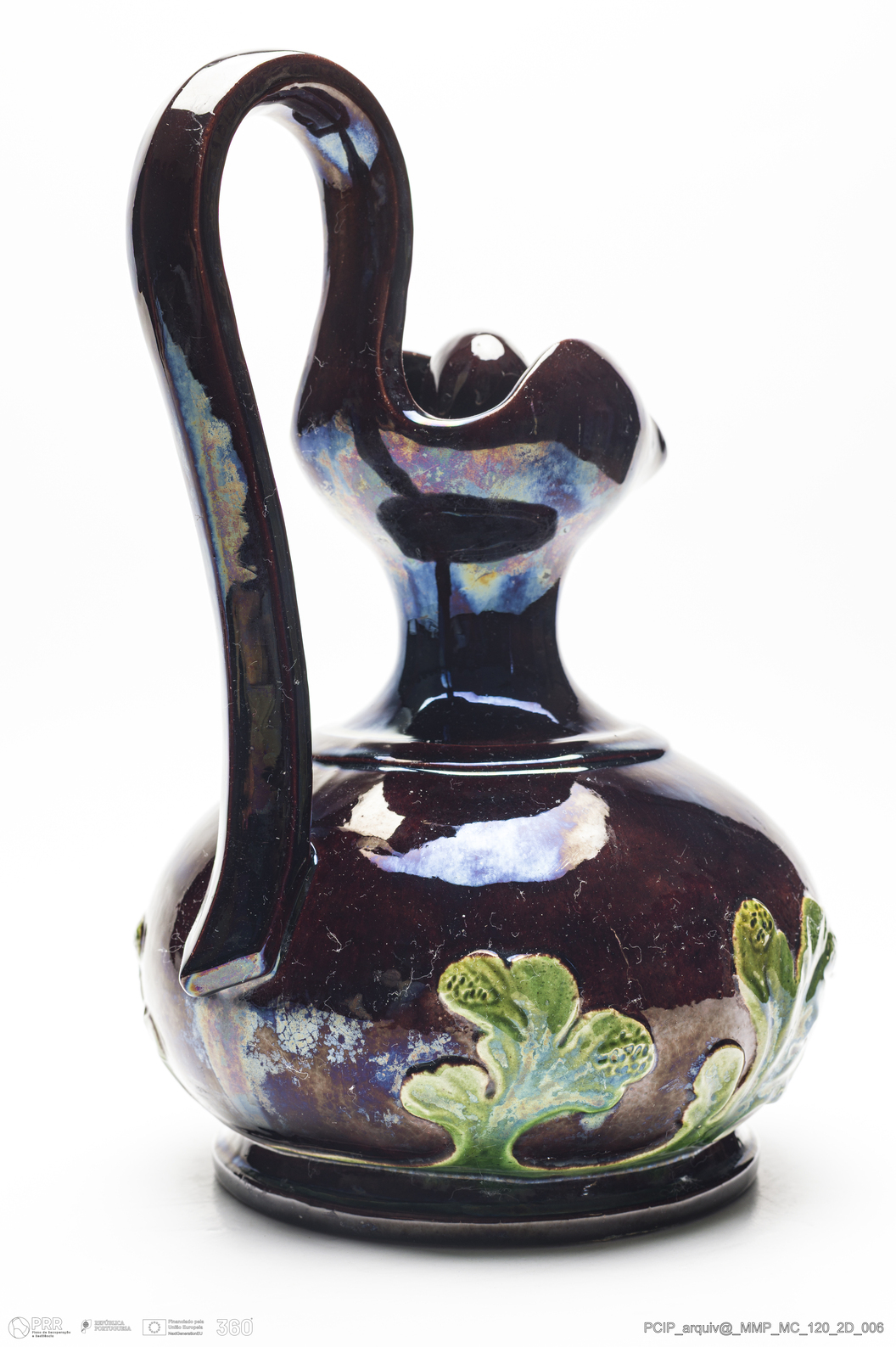 Matéria/Técnica: Barro vermelho moldado e modelado. Vidrado polícromo: castanho e verde; Cronologia: 1911; Autoria: Manuel Gustavo Bordalo Pinheiro / Fábrica Bordalo Pinheiro, Caldas da Rainha, Portugal; Dimensões (cm): Altura: 26; Largura: 20.