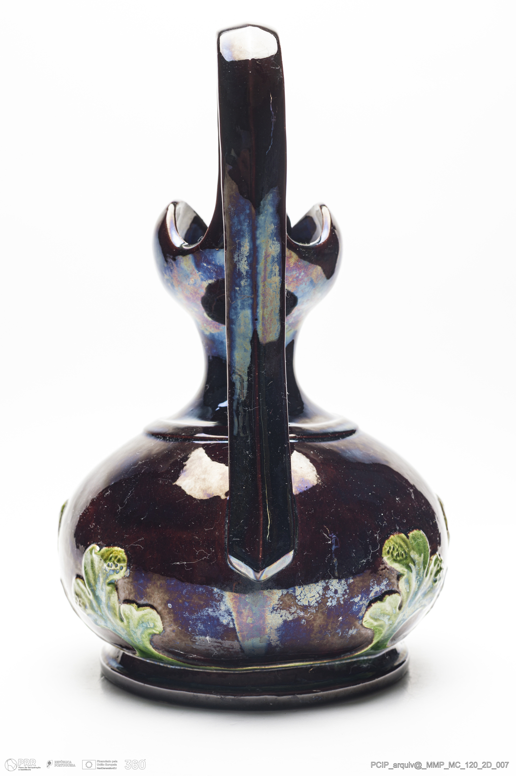 Matéria/Técnica: Barro vermelho moldado e modelado. Vidrado polícromo: castanho e verde; Cronologia: 1911; Autoria: Manuel Gustavo Bordalo Pinheiro / Fábrica Bordalo Pinheiro, Caldas da Rainha, Portugal; Dimensões (cm): Altura: 26; Largura: 20.
