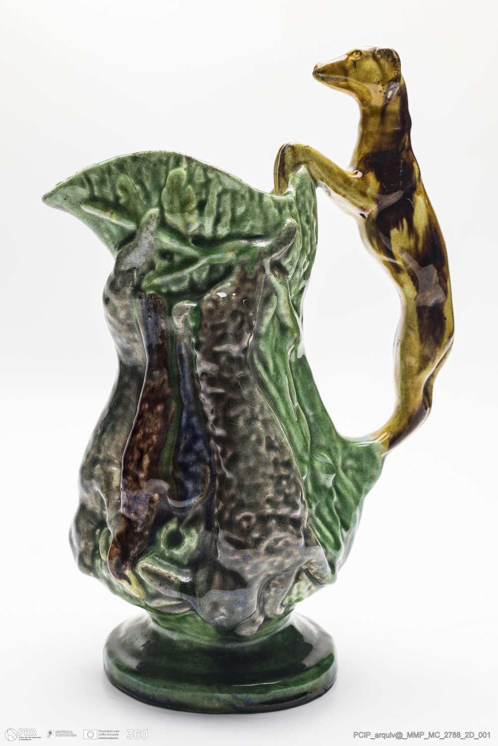 Matéria/Técnica: Barro vermelho moldado e modelado. Vidrado polícromo: castanho, verde e amarelo; Cronologia: século XX; Autoria: Desconhecido / Caldas da Rainha, Portugal; Dimensões (cm): Altura: 27; Largura: 13; Comprimento: 16.
