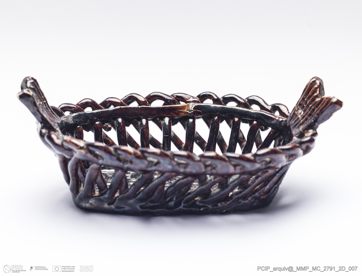 Matéria/Técnica: Barro vermelho moldado e modelado. Vidrado castanho escuro, amarelo, camurça e branco; Cronologia: 1870-1887; Autoria: Manuel Cipriano Gomes Mafra / Fábrica De Manuel Cipriano Gomes O Mafra, Caldas da Rainha, Portugal; Dimensões (cm): Altura: 33,1; Largura: 18,5; Comprimento: 27,5.